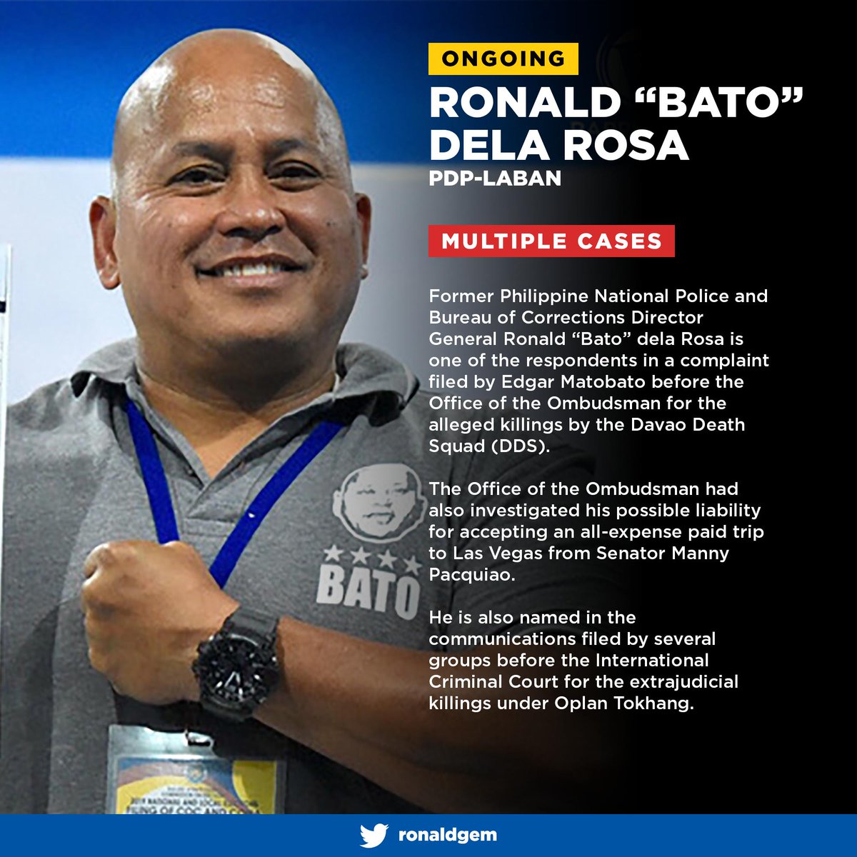 Senator Ronald Bato Dela Rosa Davao City Philippines. Dela Rosa is running under the PDP-Laban faction backed by President Rodrigo Duterte and will have Sen. This as he slammed critics for nitpicking on his pants and watch which trolls used to mock the candidate after he.